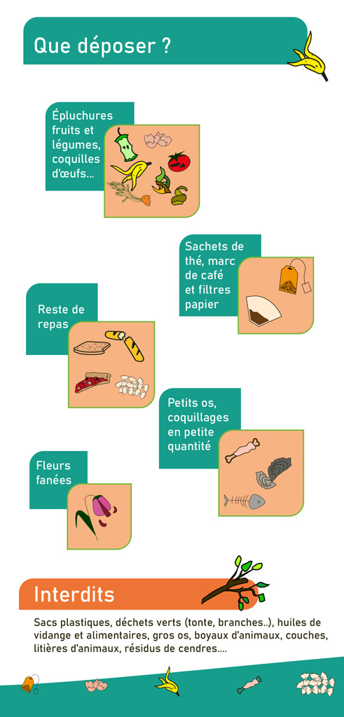 Reste de repas, de viande ou de poisson, agrumes, épluchures tous les biodéchets alimentaires peuvent être déposés.